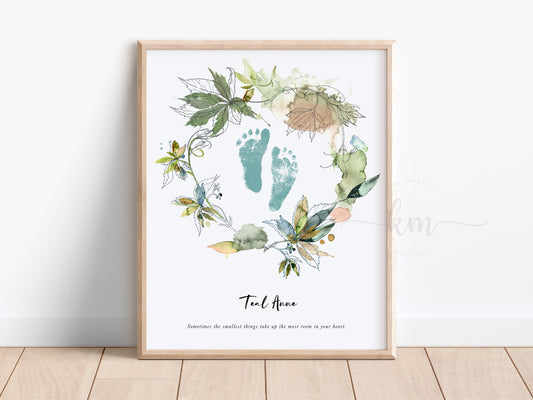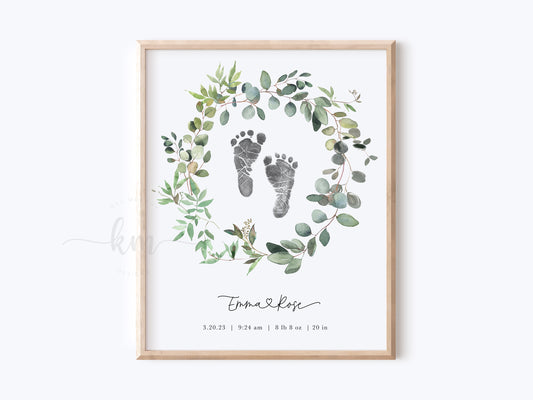 Baby Footprint Art with Watercolor Eucalyptus Wreath
