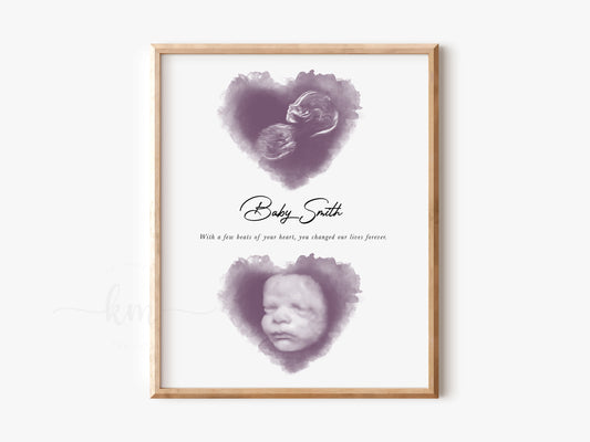 Splatter Heart Watercolor Ultrasound Art with Heartbeat and Footprints or Handprints