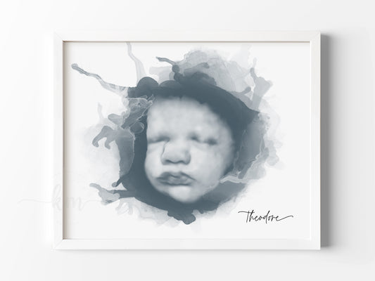 Hand-Painted Black & White Watercolor Ultrasound Art (Vertical)