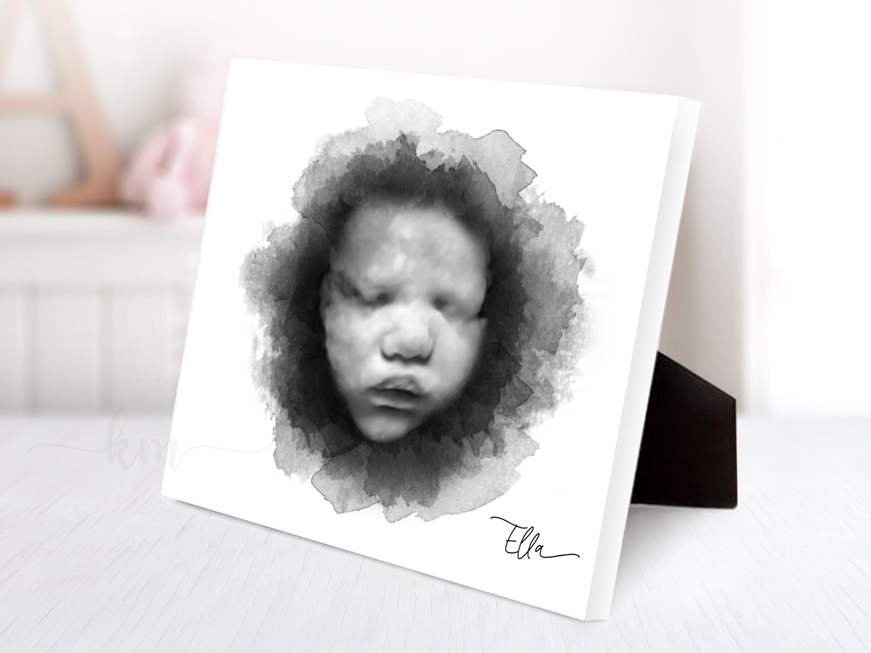 The Mounted Art Stand is the perfect way to showcase your custom ultrasound art, embryo art, or baby footprint art, blending elegance and functionality seamlessly. Each piece, printed on pearl photographic paper, is expertly laminated for protection and mounted to a solid wood base, ensuring durability and a premium finish.