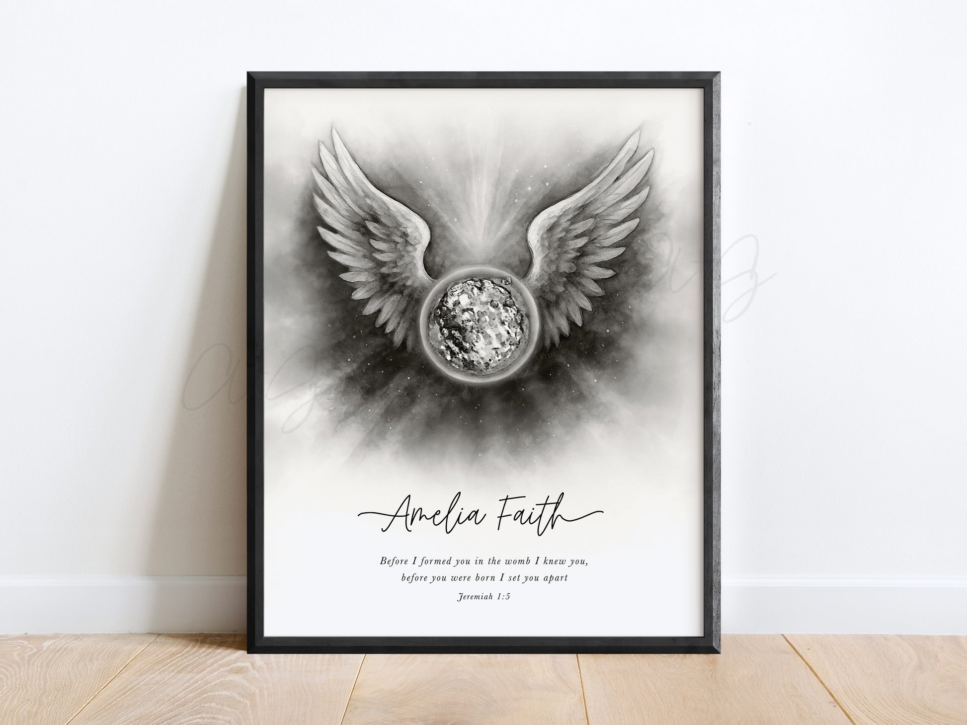 Watercolor embryo art with angel wings is a meaningful Christian baby loss memorial, created to honor miscarriage and pregnancy loss with faith and love. Featuring your baby’s embryo at the center, this design is surrounded by soft, radiant angel wings - a symbol of God’s protection and love. It’s a meaningful gift for IVF parents, fertility journeys, or families grieving a miscarriage, offering comfort and hope through faith-filled art. Personalize with the name, birth stats, Bible verse, or a special message.
