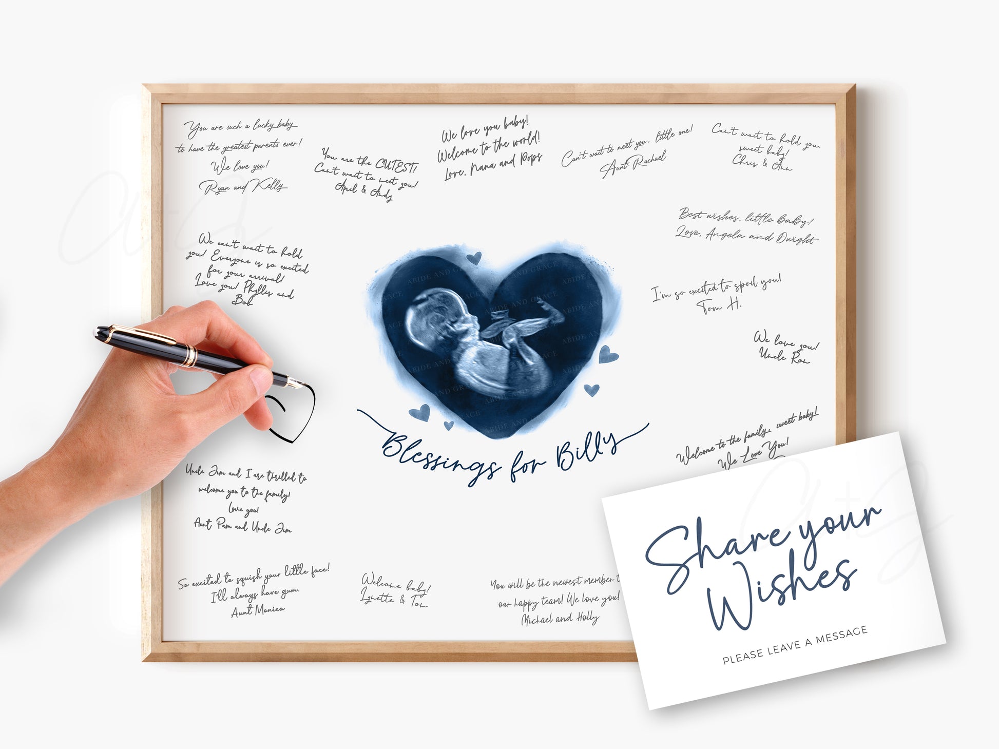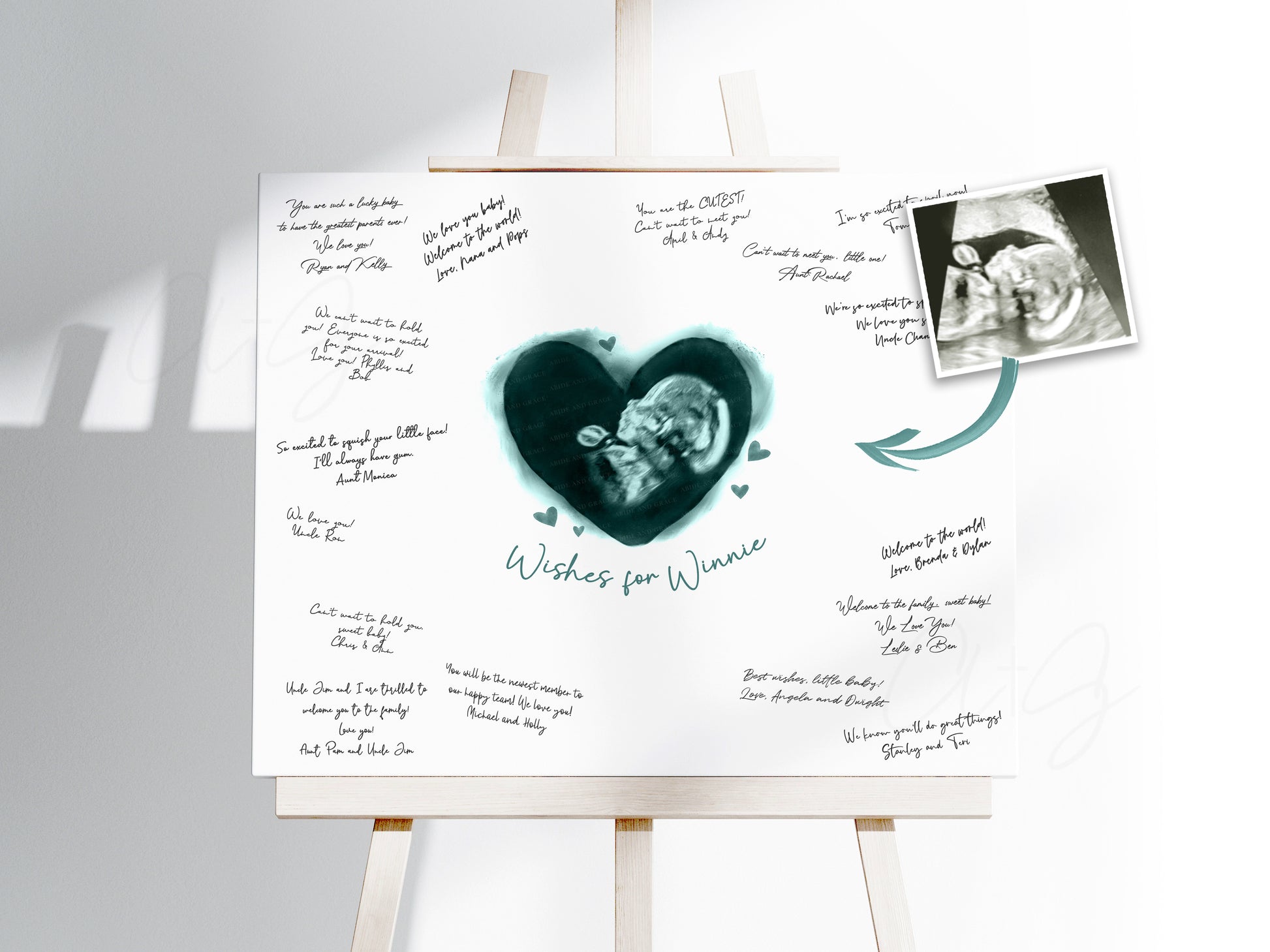 Create a lasting memory with our Baby Shower Guestbook Print — a unique guestbook alternative and thoughtful baby shower gift. This custom hearts watercolor ultrasound art preserves your baby's first image while inviting guests to leave heartfelt messages. A cherished keepsake and meaningful addition to your nursery, it features your baby’s ultrasound in our signature watercolor design and will be treasured for years to come.