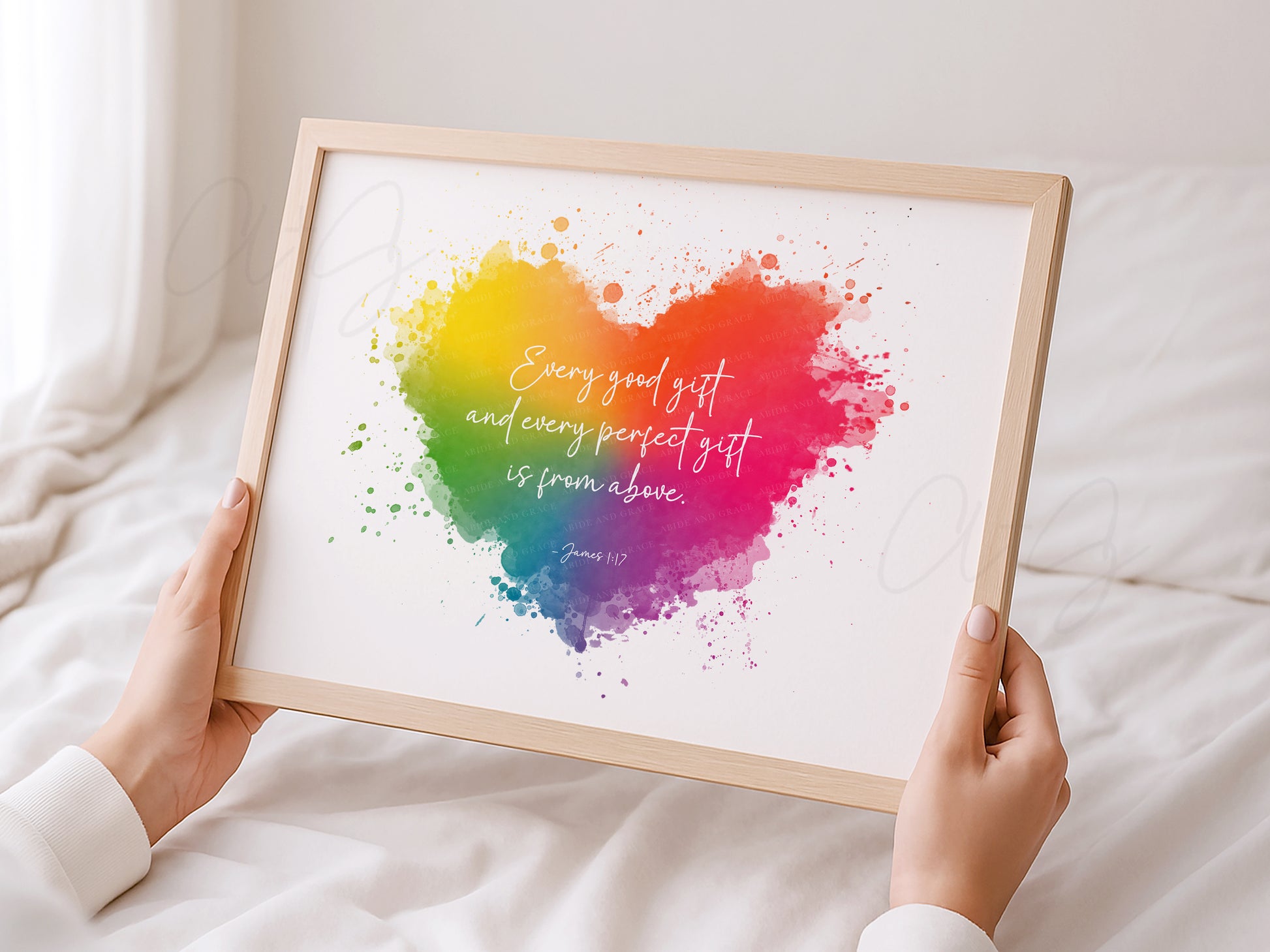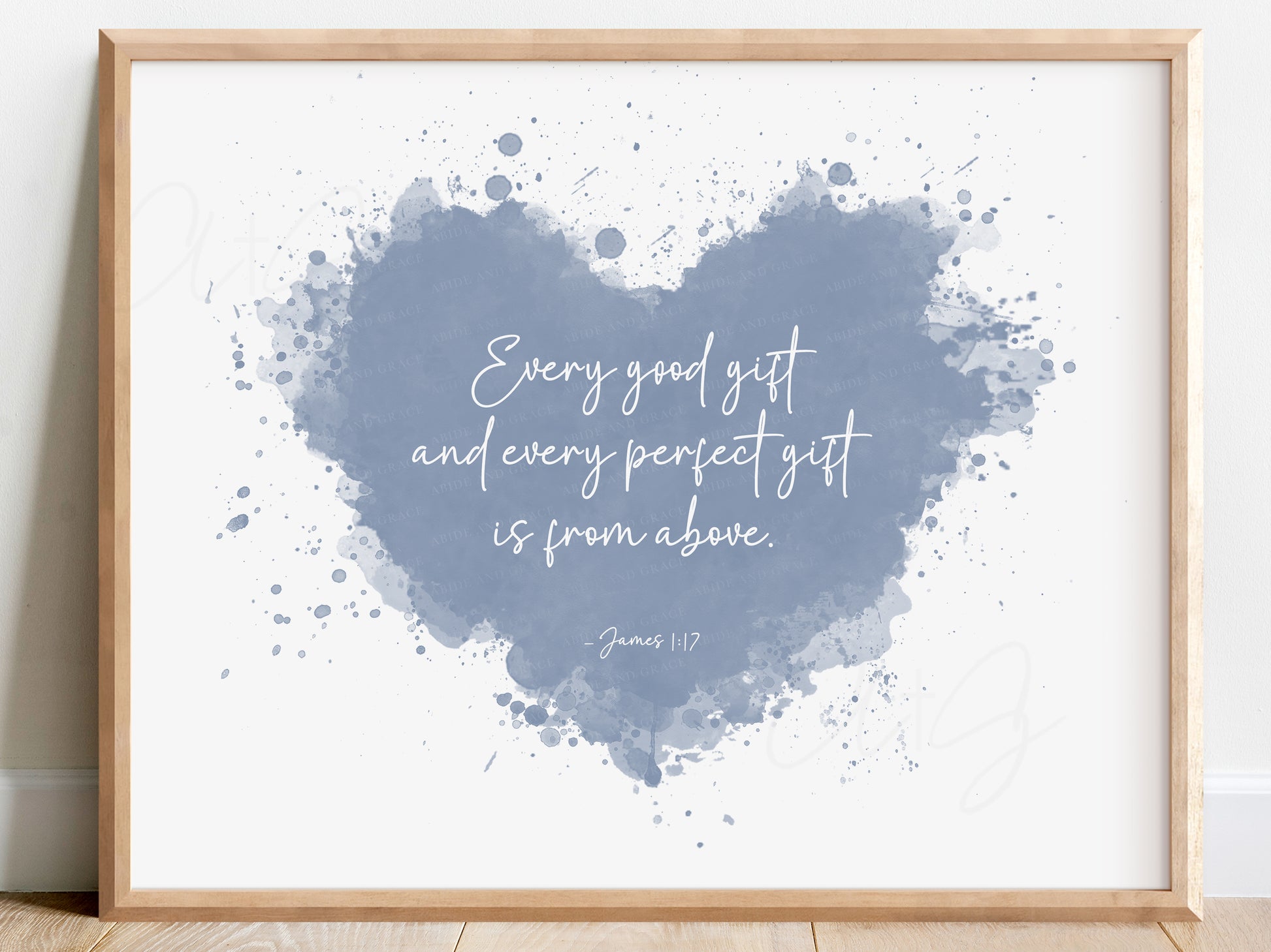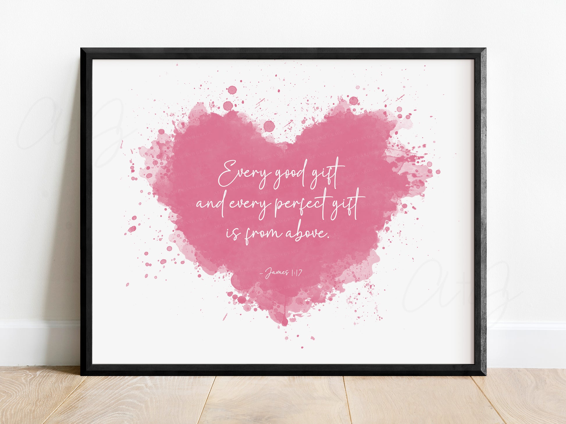 James 1:17 heart Scripture art celebrates the joy and blessing of new life, making it especially meaningful for rainbow babies or anyone cherishing God’s good gifts. This heart-shaped Bible verse print features “Every good gift and every perfect gift is from above.”