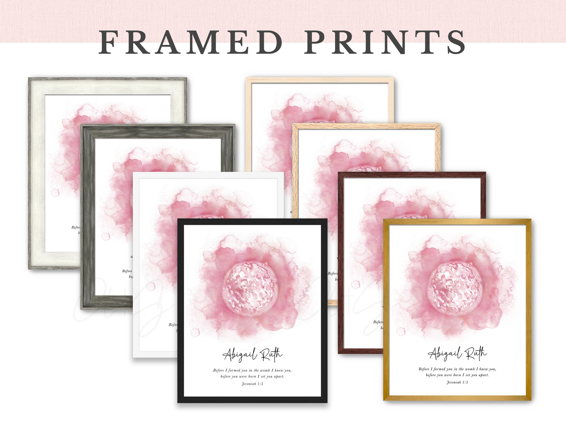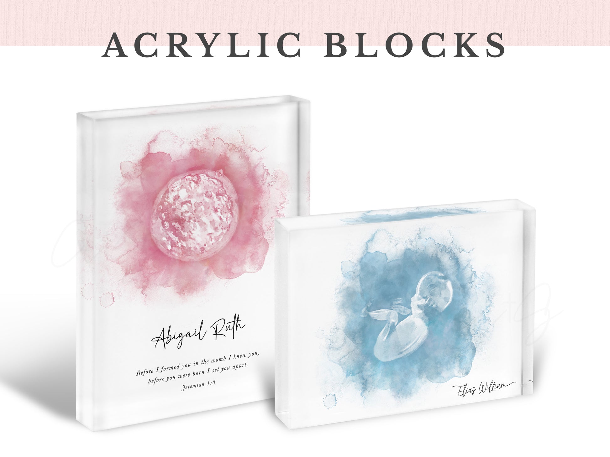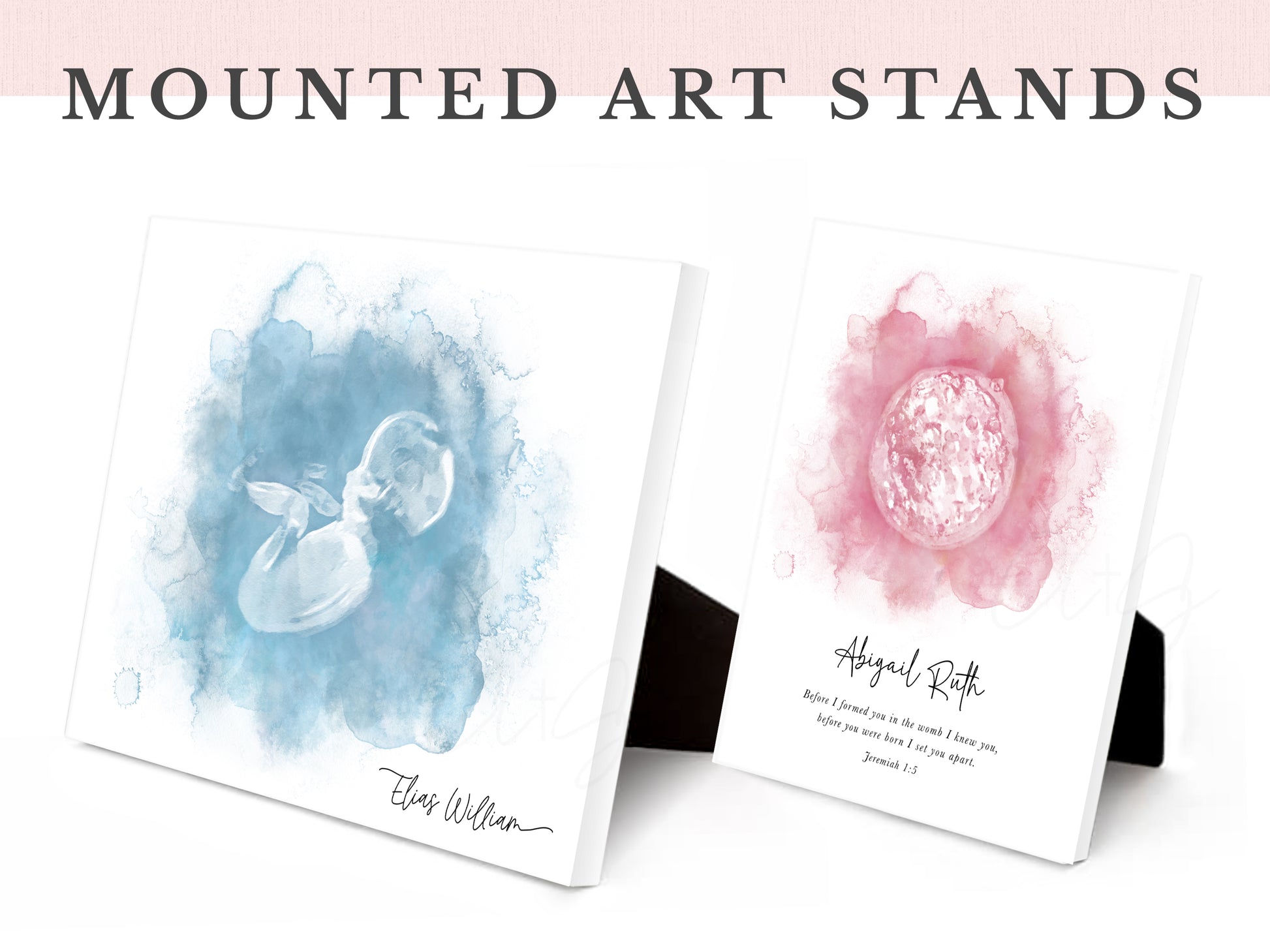 Our hand-painted embryo art and watercolor baby keepsakes make the perfect IVF gift, fertility gift, or miscarriage gift, honoring pregnancy loss. Specializing in fertility gifts and gifts for new moms, our watercolor design is carefully painted from your baby’s embryo, capturing every delicate detail with visible brush strokes for a truly artistic feel. This design features your embryo at the center, set against a soft watercolor background with a versatile color palette to complement your decor. Personalize with the name, birth stats, Bible verse, or a special message. If adding more than just the name, we may recommend a vertical layout to keep the design larger.