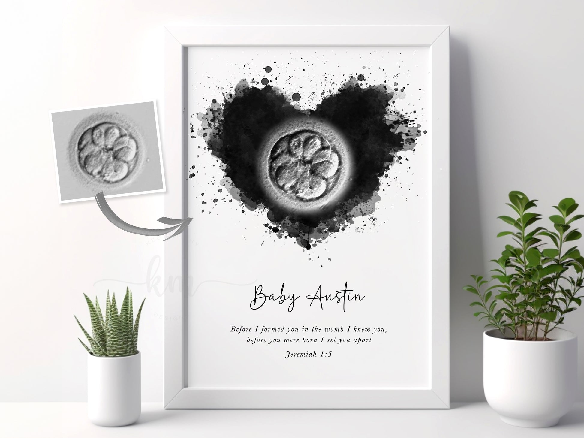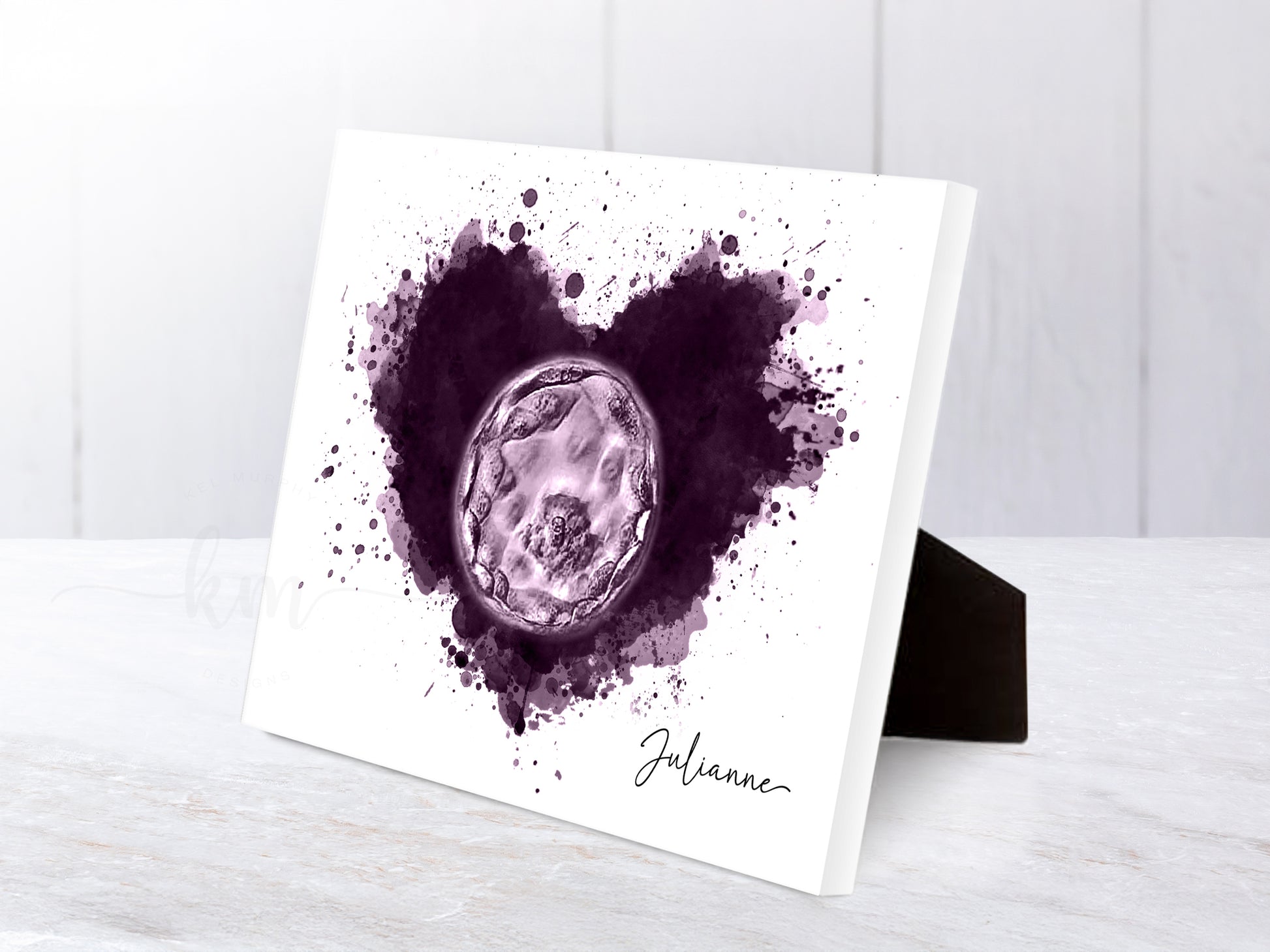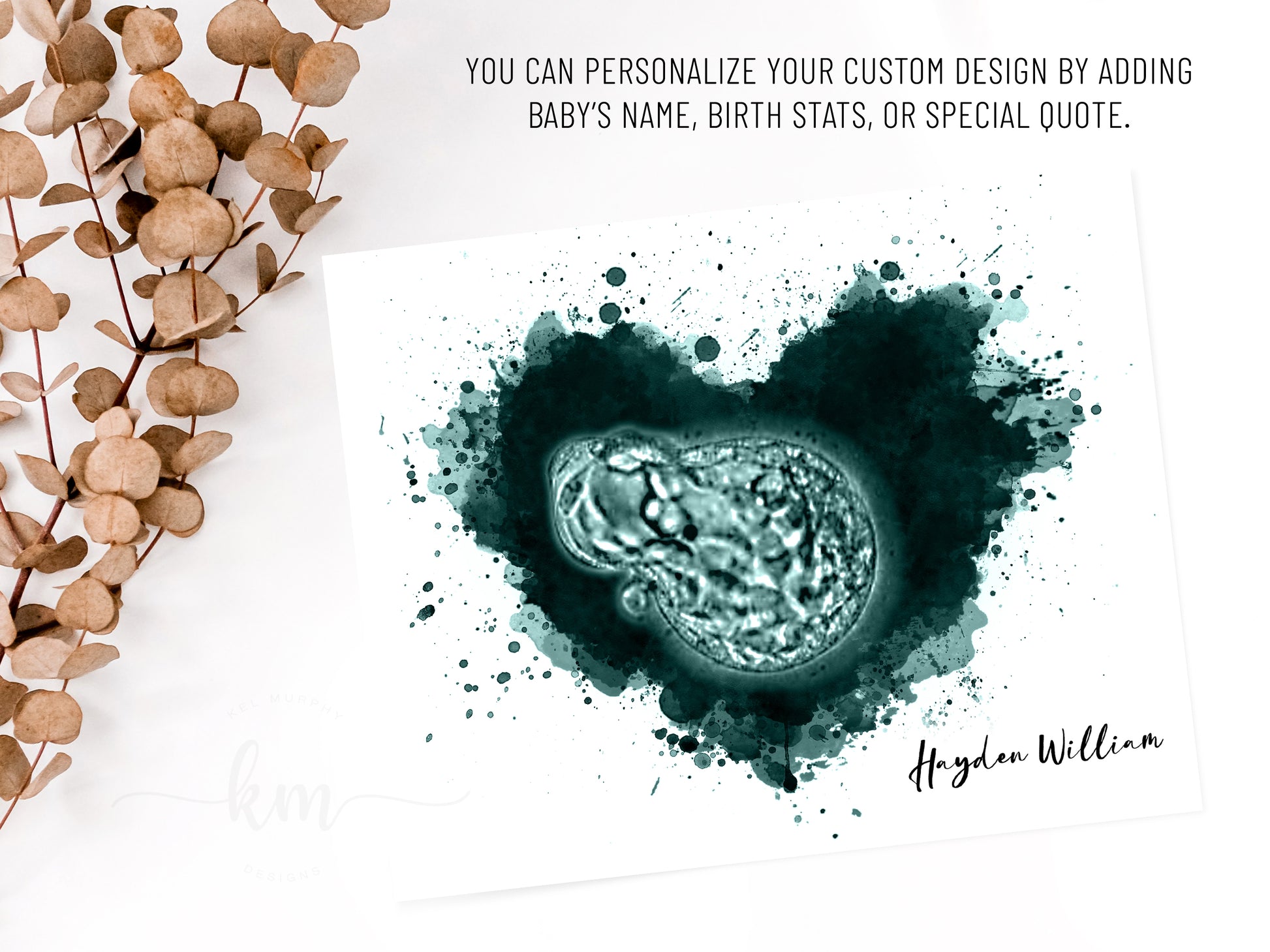 Our watercolor embryo art and custom baby keepsakes make the perfect IVF gift, fertility gift, or miscarriage gift, honoring pregnancy loss. Specializing in fertility gifts and gifts for new moms, our splatter heart watercolor design features your baby’s embryo image. Personalize with the name, birth stats, Bible verse, or a special message to make this design uniquely yours. If adding more than just the name, we may recommend a vertical layout to keep the design larger.
