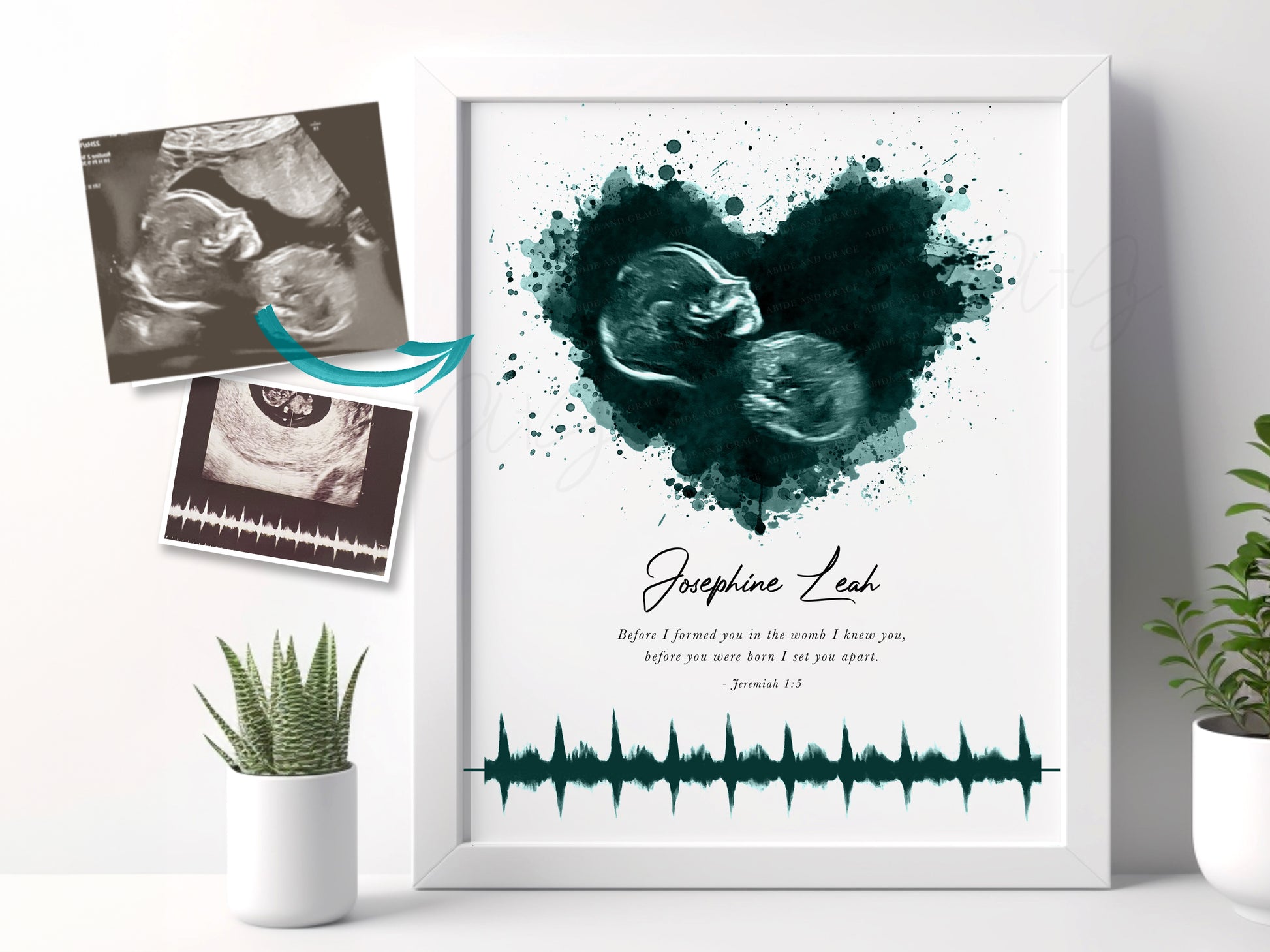Our custom watercolor ultrasound with soundwave art makes the perfect miscarriage gift, baby loss keepsake, or baby shower gift. Specializing in pregnancy loss and new mom gifts, our watercolor heart design features your baby’s ultrasound, and heartbeat as a soundwave, captured from an audio/video file or ultrasound image. Personalize with the name, birth stats, Bible verse, or a special message.